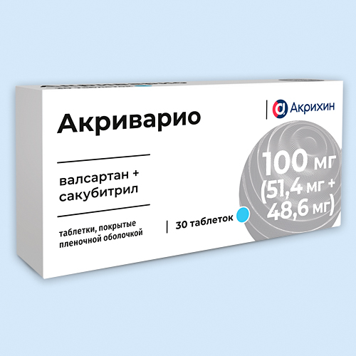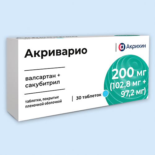 Фармакодинамические эффекты комплекса валсартана и сакубитрила оценивали после однократного и многократного применения у здоровых добровольцев, а также у пациентов с хронической сердечной недостаточностью. Отмечающиеся эффекты соответствовали механизму действия комплекса действующих веществ, состоящем в одновременном ингибировании неприлизина и блокаде РААС. В 7-дневном исследовании у пациентов со сниженной ФВЛЖ, в котором валсартан применяли в качестве контроля, применение комплекса сакубитрила и валсартана приводило к статистически значимому кратковременному увеличению натрийуреза, увеличению концентрации цГМФ в моче и снижению концентрации среднерегионального предшественника предсердного натрийуретического пептида (MR-proANP) и N-концевого фрагмента предшественника мозгового натрийуретического пептида (NT-proBNP) в плазме крови (по сравнению с валсартаном). В 21-дневном исследовании у пациентов со сниженной ФВЛЖ применение сакубитрила и валсартана вызывало статистически значимое увеличение концентрации предсердного натрийуретического пептида (ANP) и цГМФ в моче и концентрации цГМФ в плазме крови, а также снижение плазменных концентраций NT-proBNP, альдостерона и эндотелина-1 (по сравнению с исходным состоянием). Кроме того, применение комплекса сакубитрила и валсартана блокирует AT1-рецептор, на что указывает увеличение активности и концентрации ренина в плазме крови. В исследовании PARADIGM-HF комплекс сакубитрила и валсартана вызывал более выраженное снижение концентрации NT-proBNP в плазме крови и более значительное повышение концентраций мозгового натрийуретического пептида (BNP) и цГМФ в моче, чем эналаприл. В то время как BNP является субстратом неприлизина, NT-proBNP таковым не является, в связи с чем NT- proBNP, в отличие от BNP, можно использовать в качестве биомаркера при мониторинге пациентов с сердечной недостаточностью, получающих комплекс сакубитрила и валсартана. В исследовании PARAGON-HF Акриварио снижал уровни NT-proBNP, тропонина, растворимого ST2 (sST2) и увеличивал концентрацию цГМФ в моче по сравнению с валсартаном.