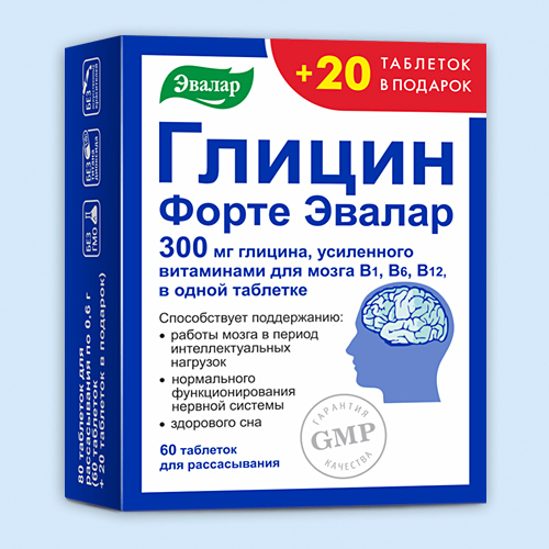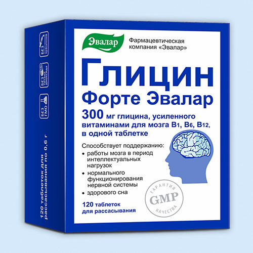 Глицин Форте Эвалар® - биологически активная добавка к пище с высоким содержанием глицина, усиленного витаминами для мозга.