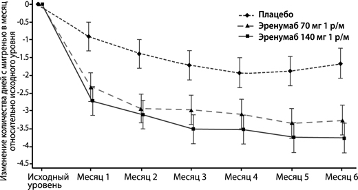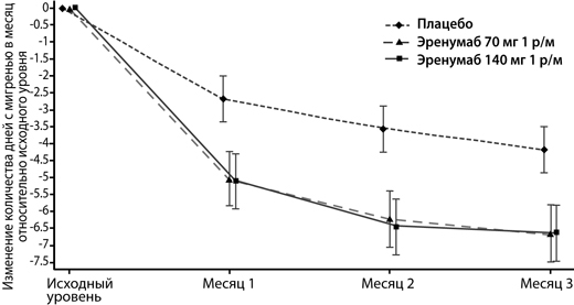Анализ ежемесячных изменений показал, что среднемесячное количество дней с мигренью снизилось по сравнению с плацебо уже в первый месяц, а последующий анализ еженедельных изменений показал, что эффект эренумаба развивался уже на первой неделе после инъекции.
