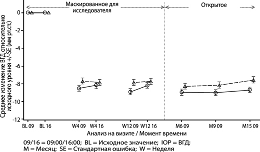 Результаты эффективности: Изменение среднего исходного значения ВГД со стандартной ошибкой (SE) по визитам и временным точкам анализа (исследование глаза, открытая популяция)