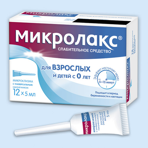 Микролакс® - комбинированный препарат, оказывающий слабительное действие. Эффект наступает через 5-15 мин. В состав препарата входят натрия цитрат (пептизатор, который вытесняет связанную воду, содержащуюся в каловых массах), натрия лаурилсульфоацетат (разжижает содержимое кишечника) и сорбитол (усиливает слабительное действие путем стимуляции поступления воды в кишечник). Увеличение количества воды за счет пептизации и разжижения способствует размягчению каловых масс и облегчает опорожнение кишечника.