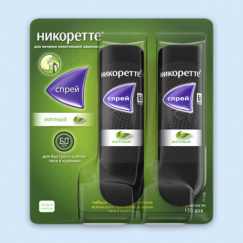 Спрей Никоретте® облегчает и/или предотвращает тягу к курению сигарет и систем нагревания табака и симптомы "отмены", возникающие при табачной зависимости: