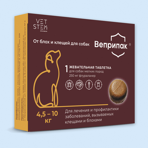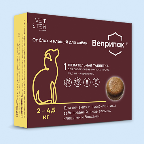 Препарат Веприпак® назначают собакам для лечения и профилактики арахно-энтомозов, вызываемых клещами и блохами, в комплексной терапии блошиного аллергического дерматита.